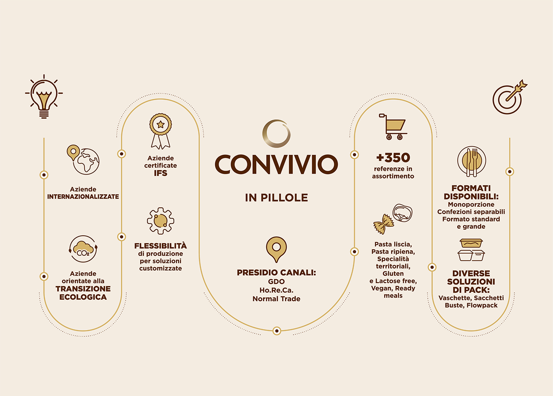 Dalla sinergia tra 5 aziende d’eccellenza nel panorama gastronomico italiano nasce Convivio, un progetto innovativo ed ambizioso dedicato alla pasta fresca e ai piatti pronti, con focus strategico anche sulle soluzioni “free from” e specialità territoriali.